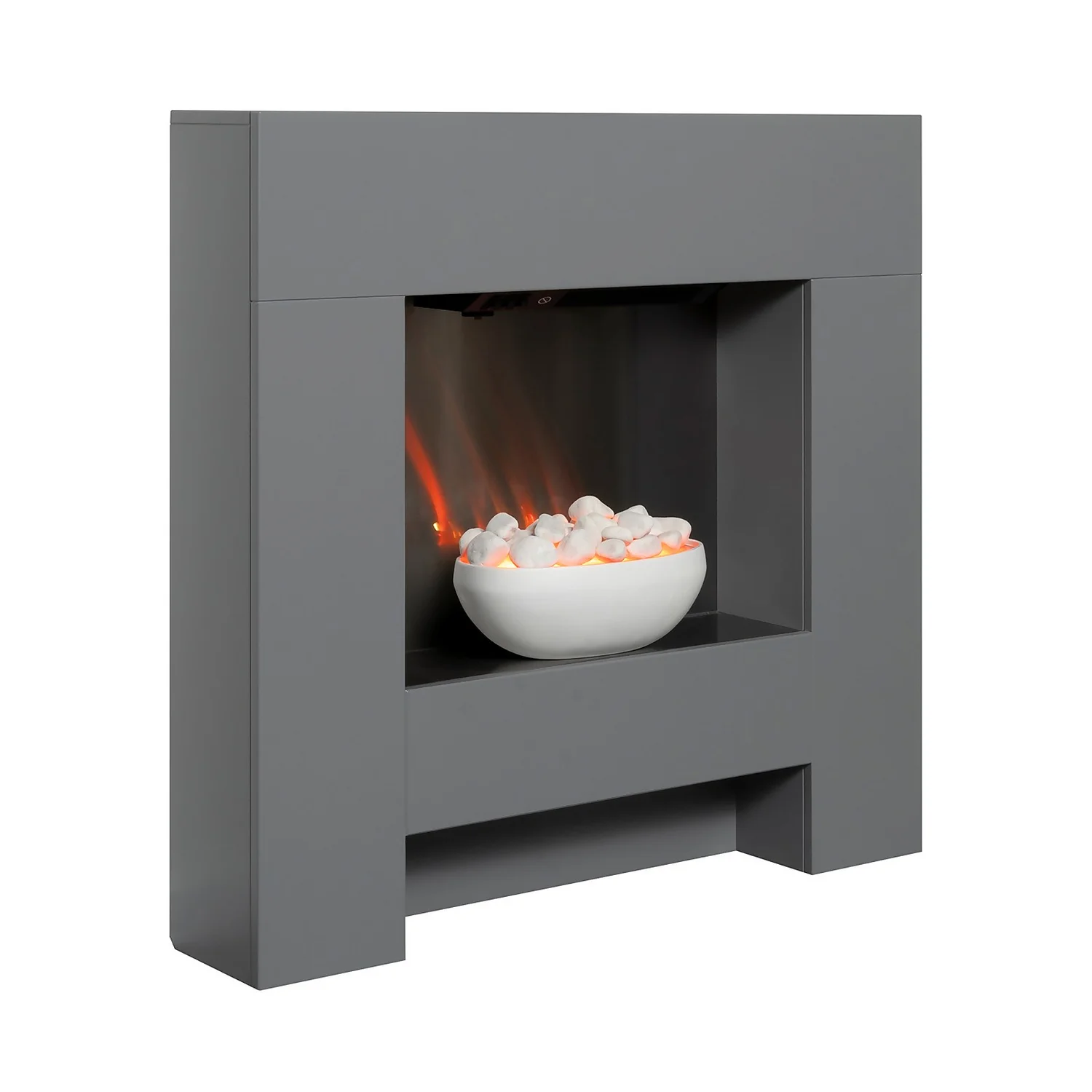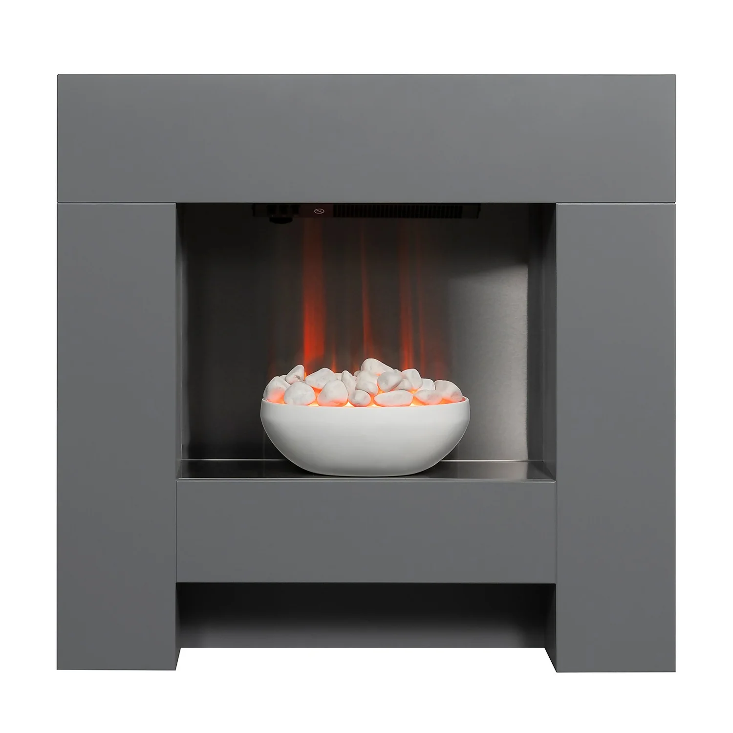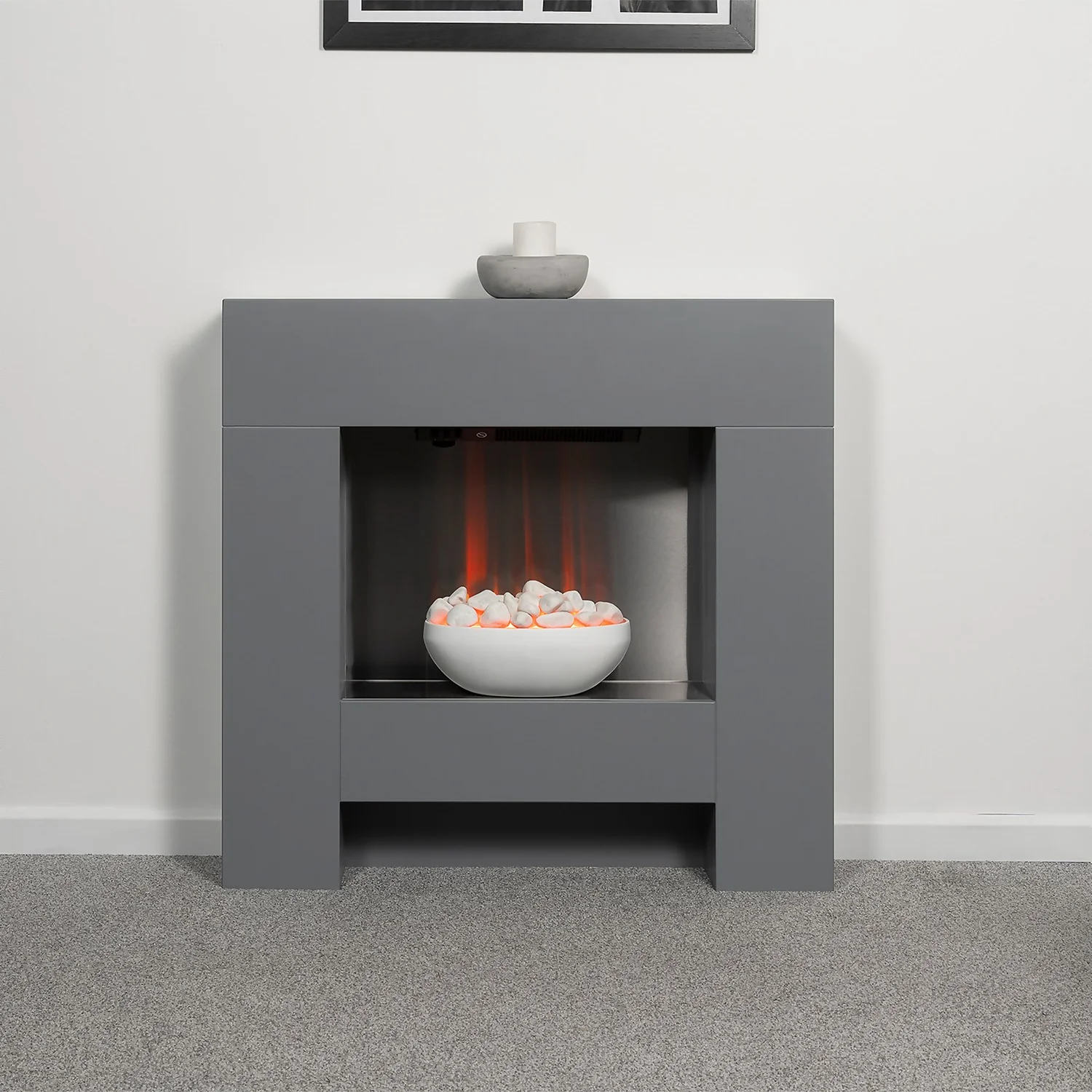 The Adam Cubist Fireplace Suite is a modern fire in every sense of the word. The eye-catching, hollowed out cube holds an electric fire that simmers gently in a bowl of pebbles. The straight, grey lines of the surround have a decidedly minimalist allure.