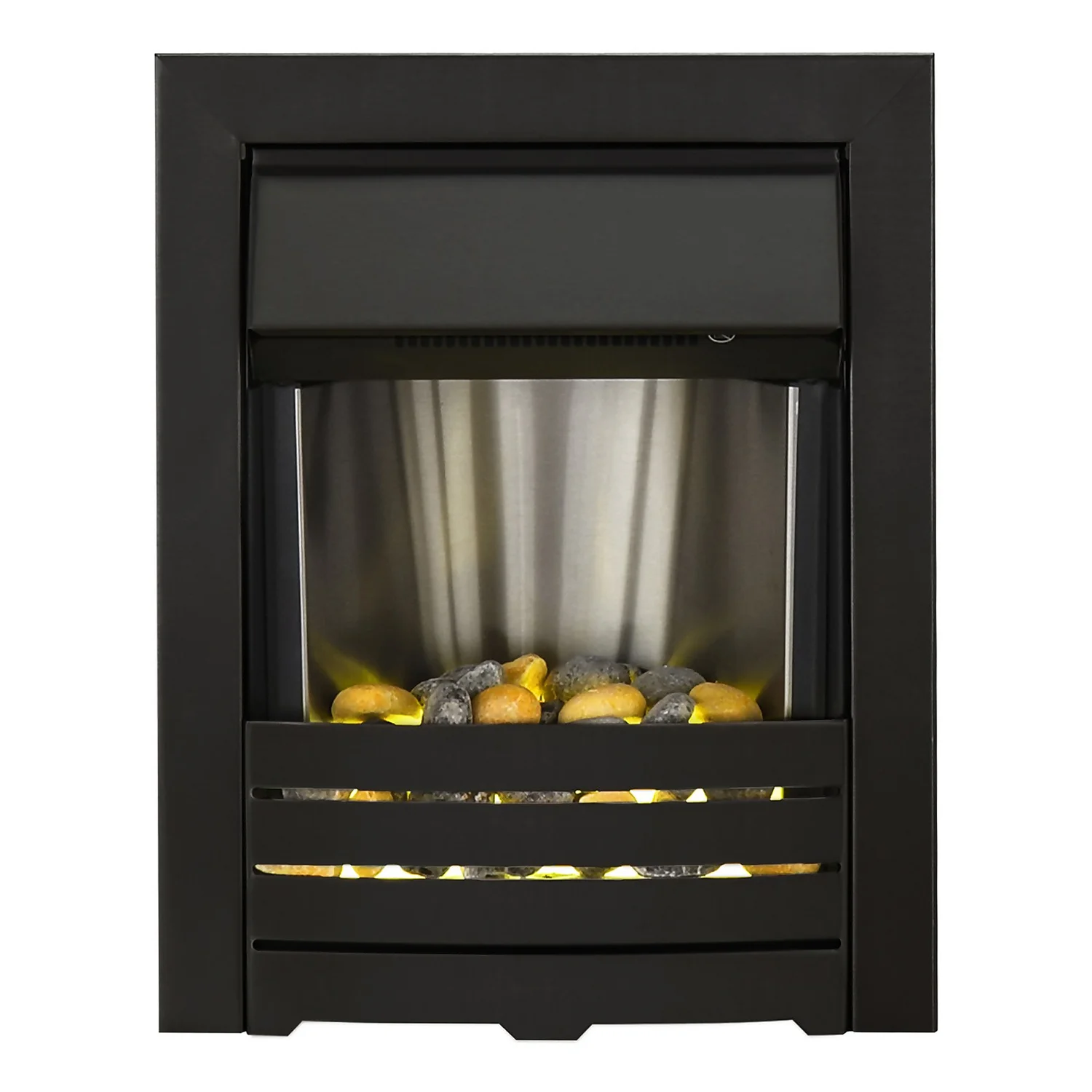 With its modern black finish the Adam Helios is a highly functional and versatile electric inset fire thanks to the two heat settings that provides a heat output of 1kW and 2kW. The heat output can be operated by the switches and thermostat along with glow only switch that is located under the canopy. The Adam Helios is also supplied with an assortment of natural pebbles for the fuel bed and also a 50mm spacer to help you adjust the inset depth. This is a perfect inset fire which can be combined with any wooden, marble or stone fireplace surround.
