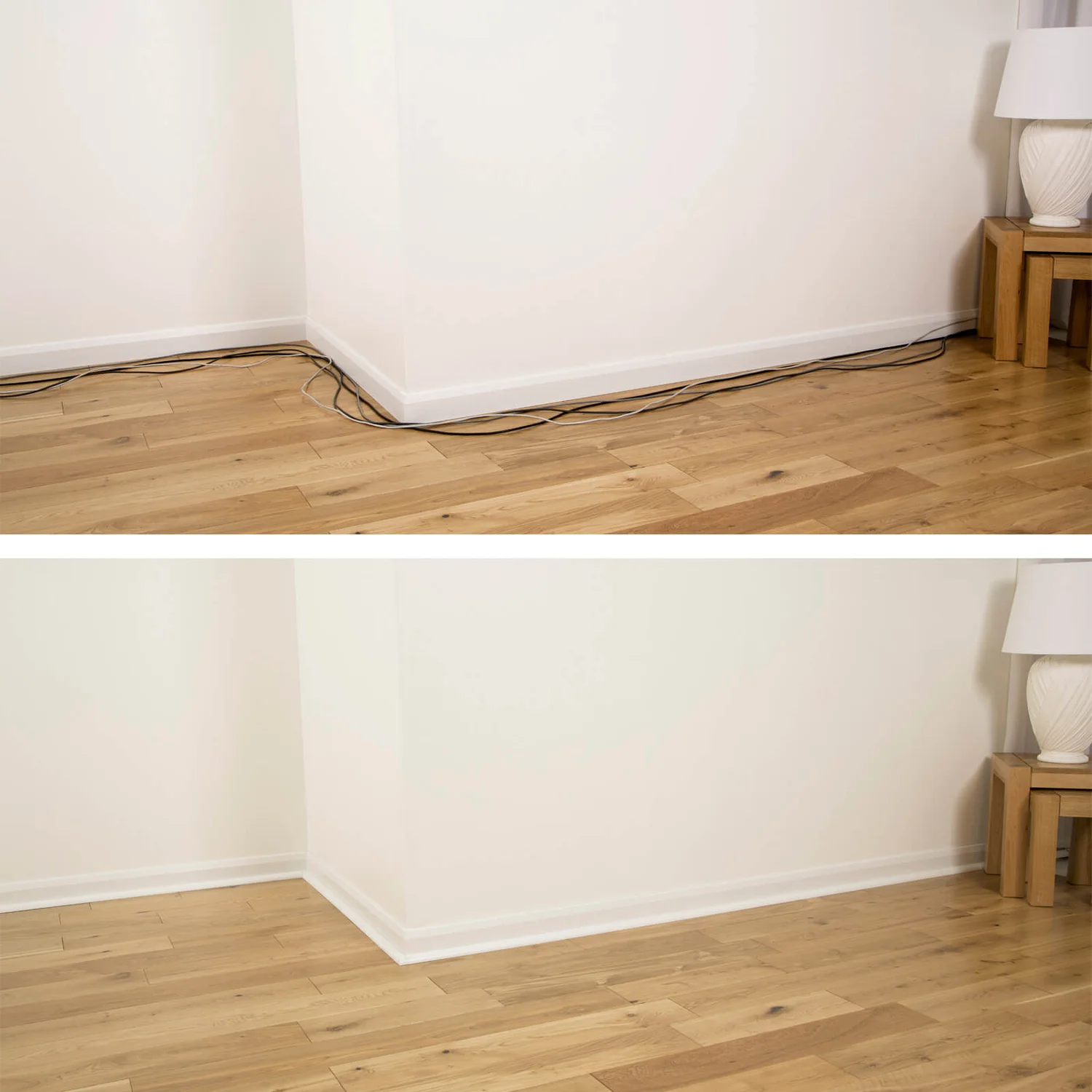 Quarter Round trunking profile (22x22mm) covers gaps between floors and skirting, while providing an easy-to-use solution around floor perimeters. The 22x22mm (W x H) dimensions of D-Line Quarter Round trunking scales well to blend with popular skirting boards, while providing capacity for cable bending radii around corners. Traditional floor edging is usually nailed, requiring perfect measuring of lengths before corners can be mitre-cut at 45º angles. By contrast D-Line quarter-round trunking can simply peel-and-stick to skirting, while the Clip-Over corner-bends save any need for precise measuring and can cover oblique cuts. Compared to regular floor trim, D-Line Quarter Round trunkings features combine to enable approximately 50% quicker installations – and then it’s easy to add or remove cables!