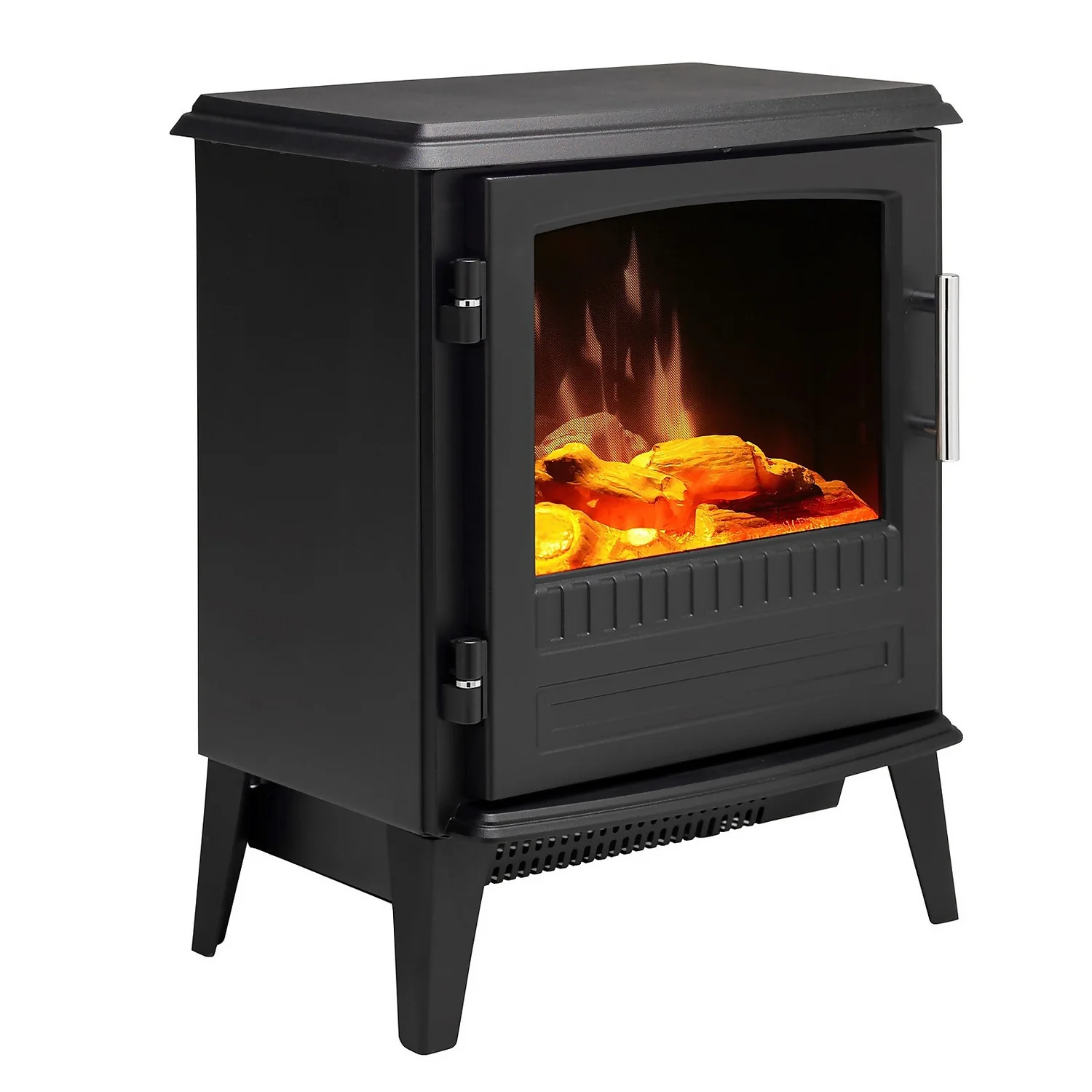 The Dimplex Bari electric stove has an opening door with chrome detail on the door handle. It also comes with a remote control as standard to operate the heat and light settings.