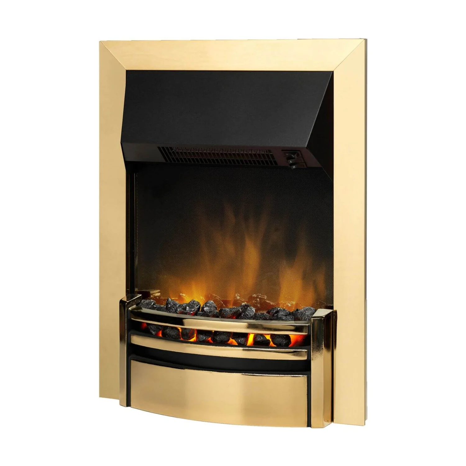 - Stunning one piece electric inset fire with brass fret and trim underneath a contrasting black canopy