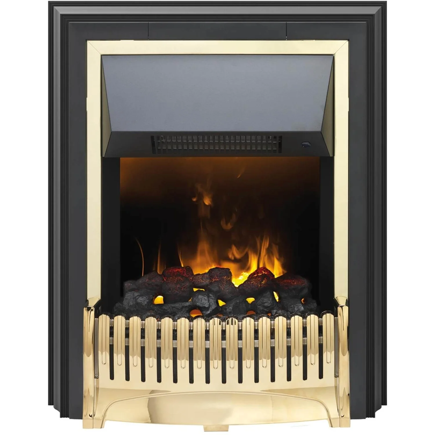 - A brilliant brass finish on this truly adaptable freestanding electric fire which features a unique 3D smoke and flame effect