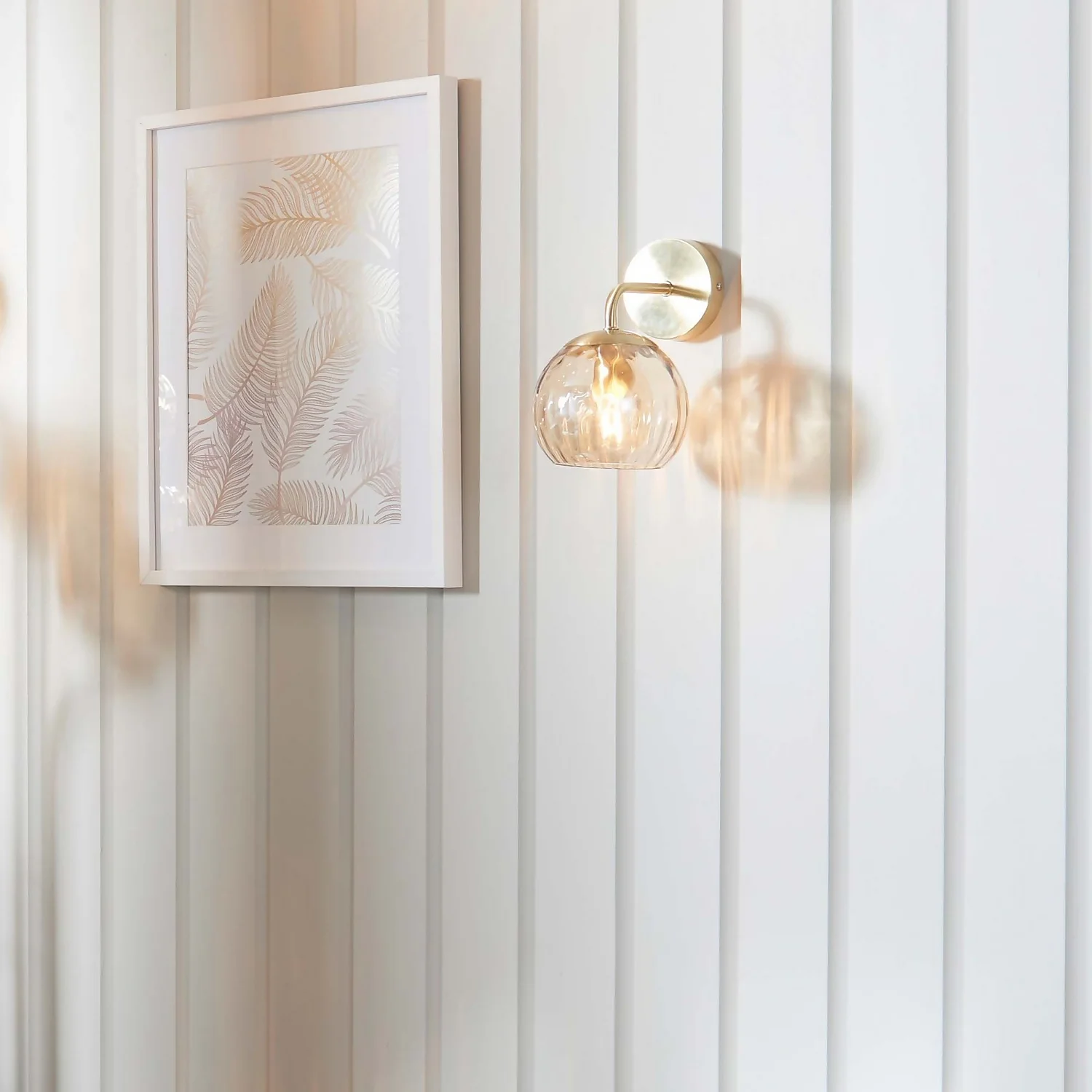 Champagne lustre glass meets modern satin brushed gold plating in a combination of modern classic styling. This wall light is the perfect addition to your modern home. Add a touch of style to your interior with a matching ceiling light and floor lamp. Ideal when paired with up to date LED filament lamps.