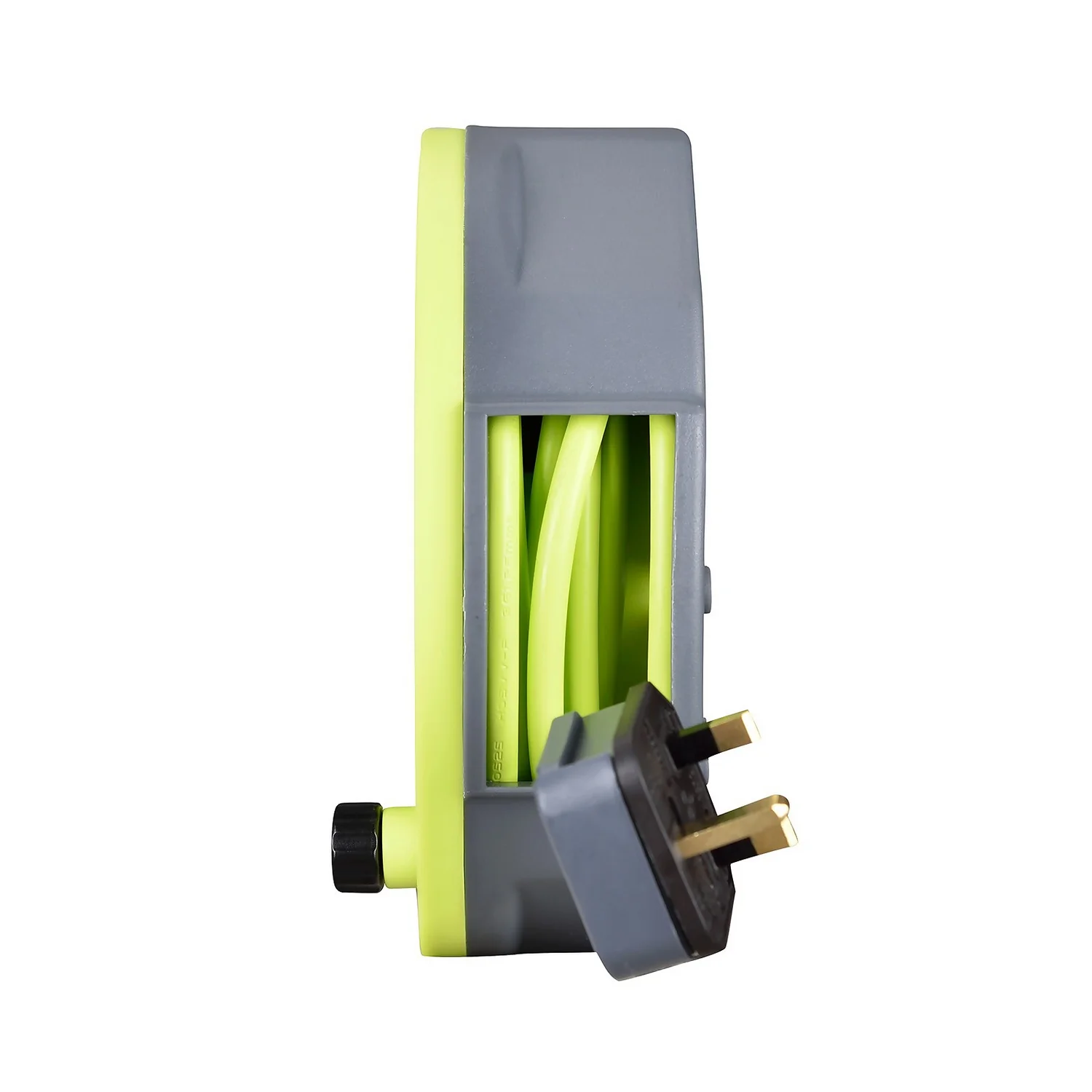 The lightweight and portable cable reel has four shuttered sockets, LED indicator, integrated power switch and a safety thermal cut-out for protection against overloading when fully reeled. The compact nature allows for easy transportation and storage.