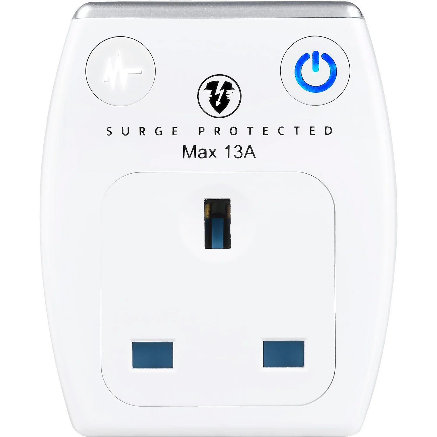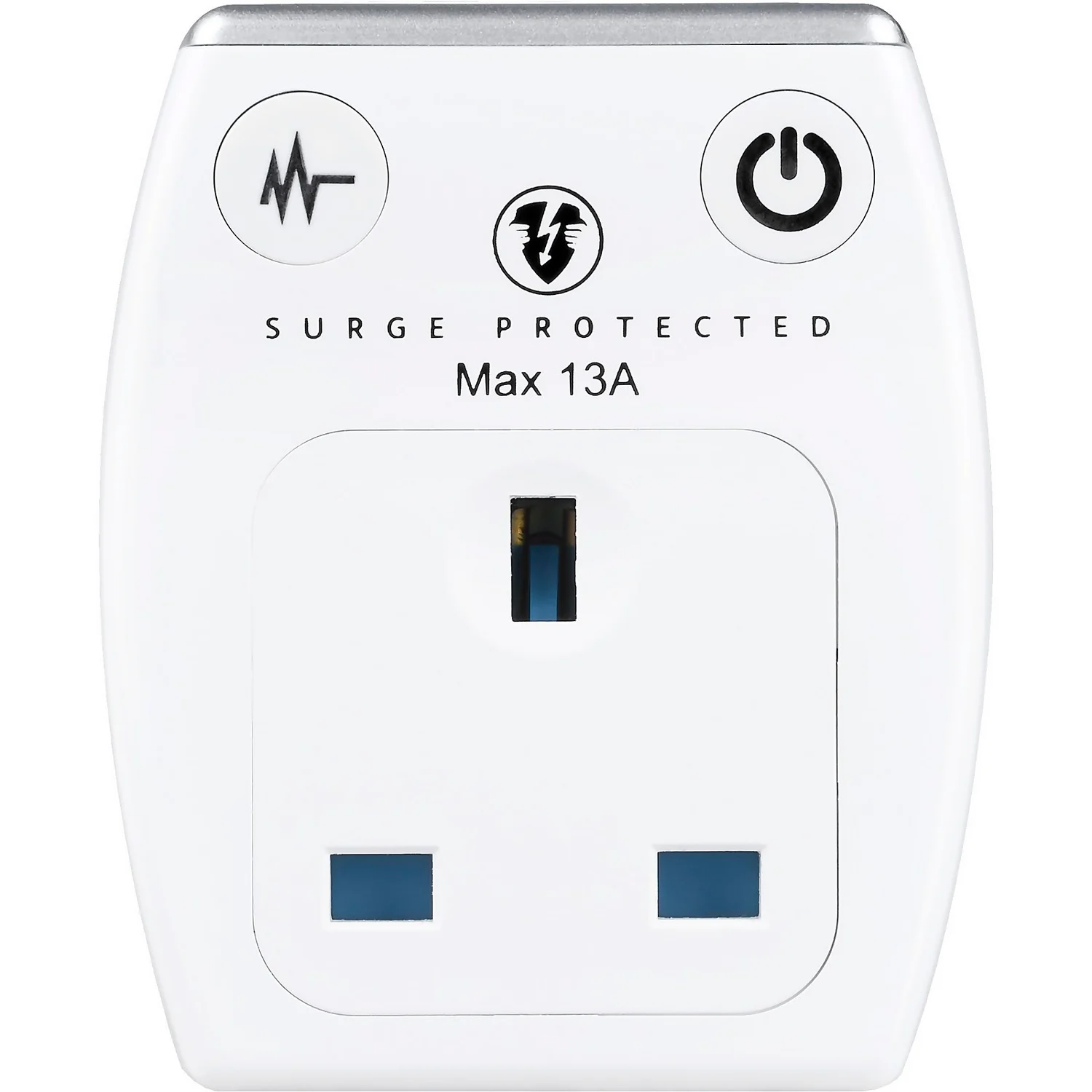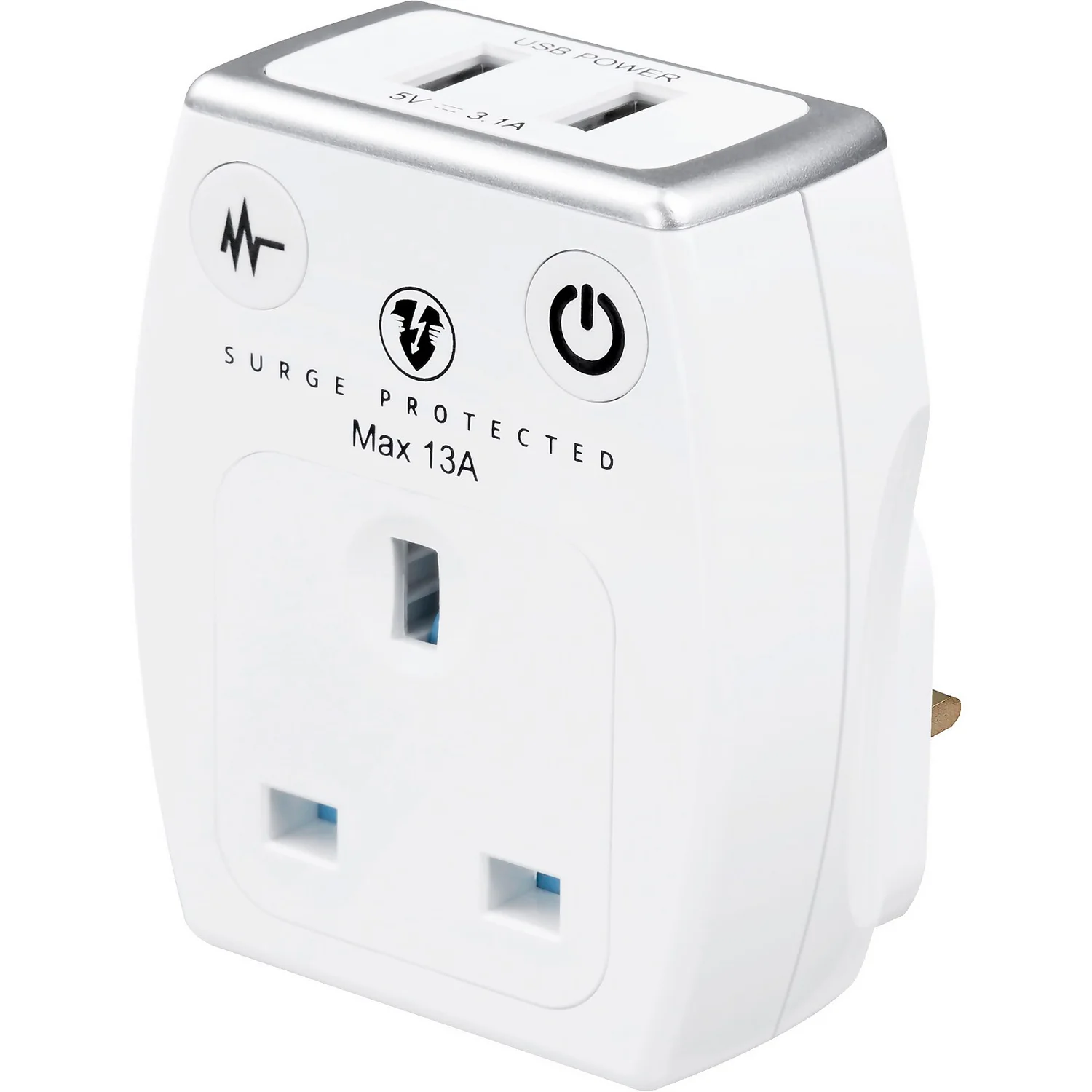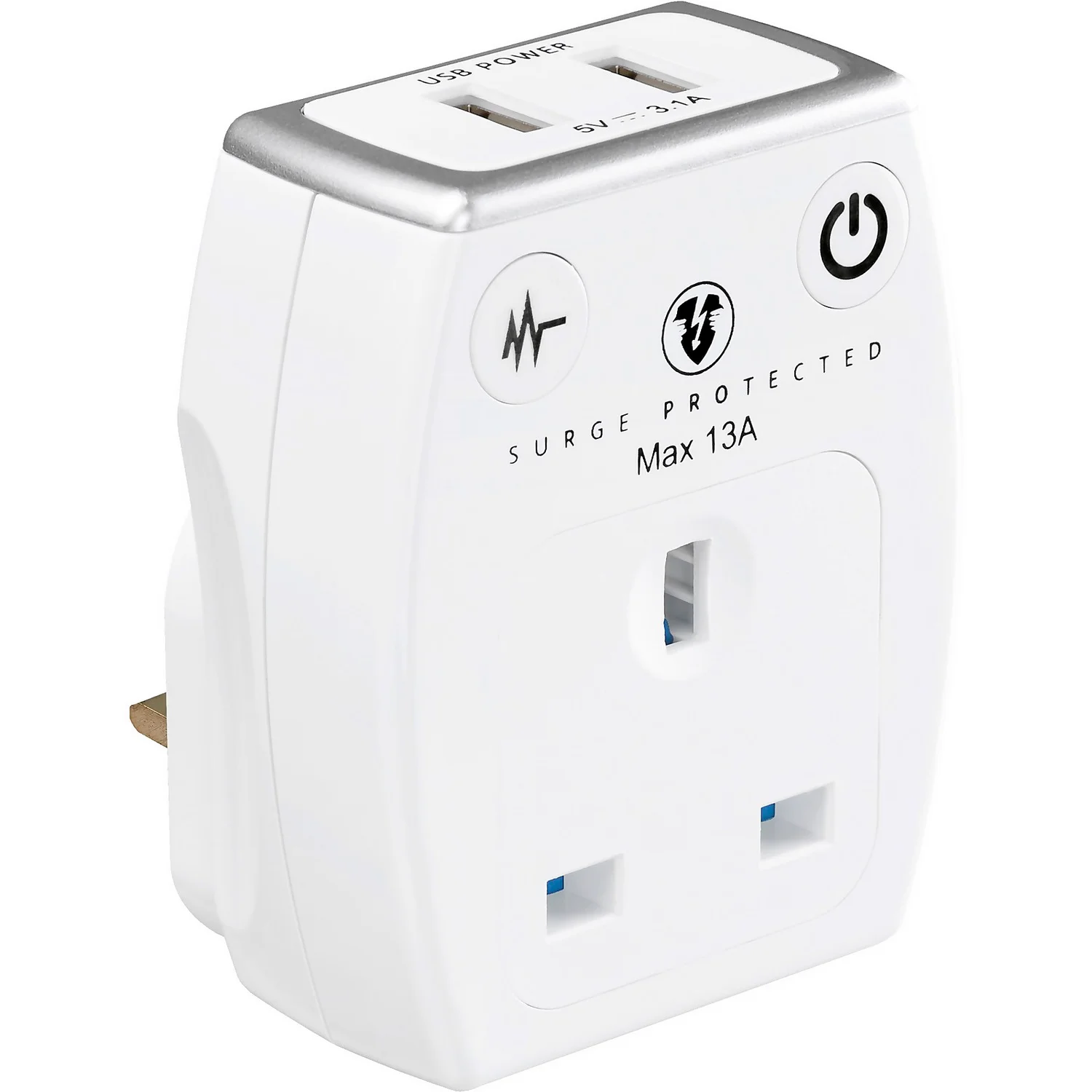 A space-saving surge protected power adaptor that is designed to protect your electrical appliances from power surges and spikes. This single socket power adaptor has a safety shuttered sockets with the two USB charging ports allowing you to charge mobile devices without losing socket space.