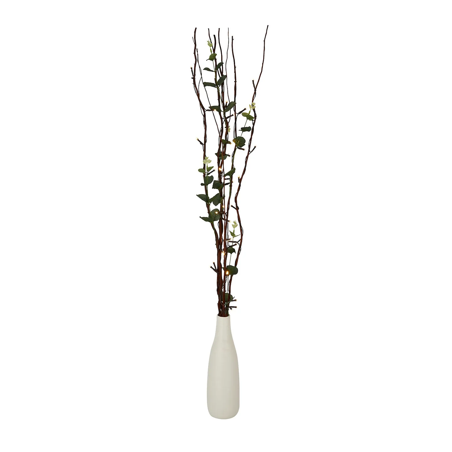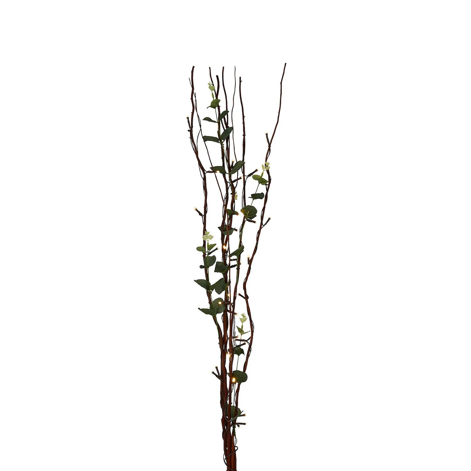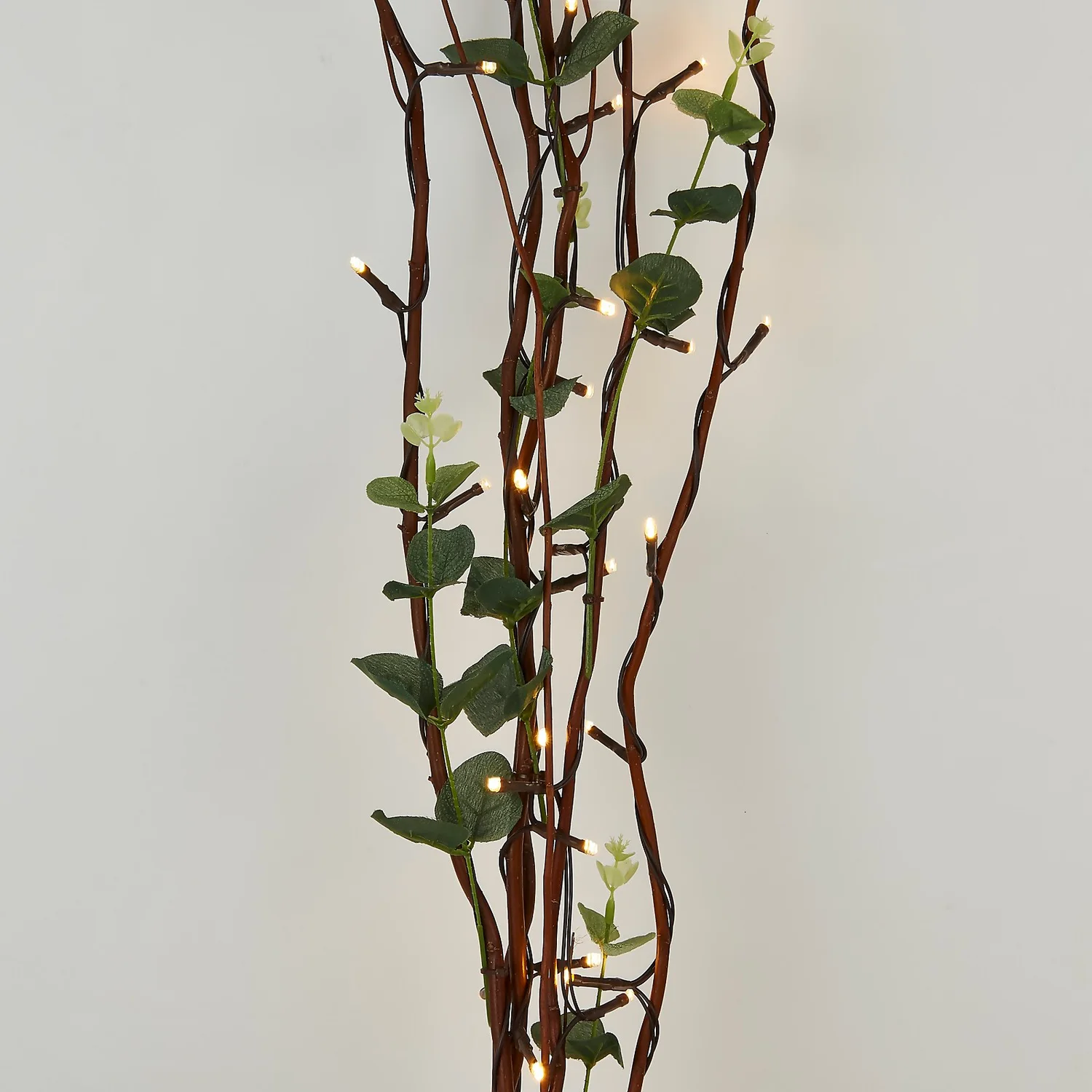 Decorative faux eucalyptus leaves and twigs are intertwined with fairy lights to give a simple, effective display that brightens up any living space.