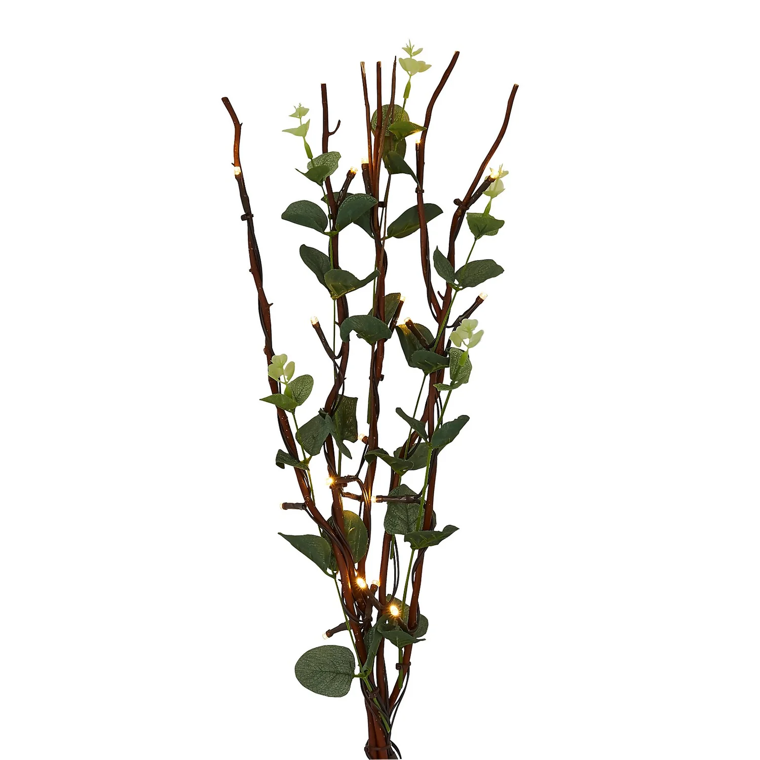 Decorative faux eucalyptus leaves and twigs are intertwined with fairy lights to give a simple, effective display that brightens up any living space.