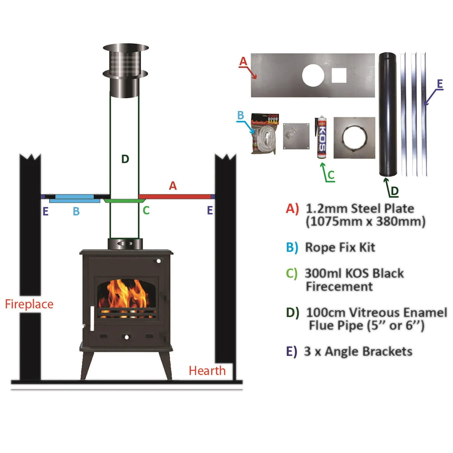 Stove Fixing Kit, consisting of a 1.2mm steel plate, (1075mm x 380mm) with a central circular cutout to accommodate the included collar (5 or 6 sizes available), a 4square flue access hatch and cover is also included. The kit is completed by 3 x angle brackets to fix into the chimney opening, a 1000mm x 5 or 6 single wall vitreous enamelled flue pipe, a rope fix kit and a 300ml cartridge of KOS black firecement to seal the fluepipe into the chimney.