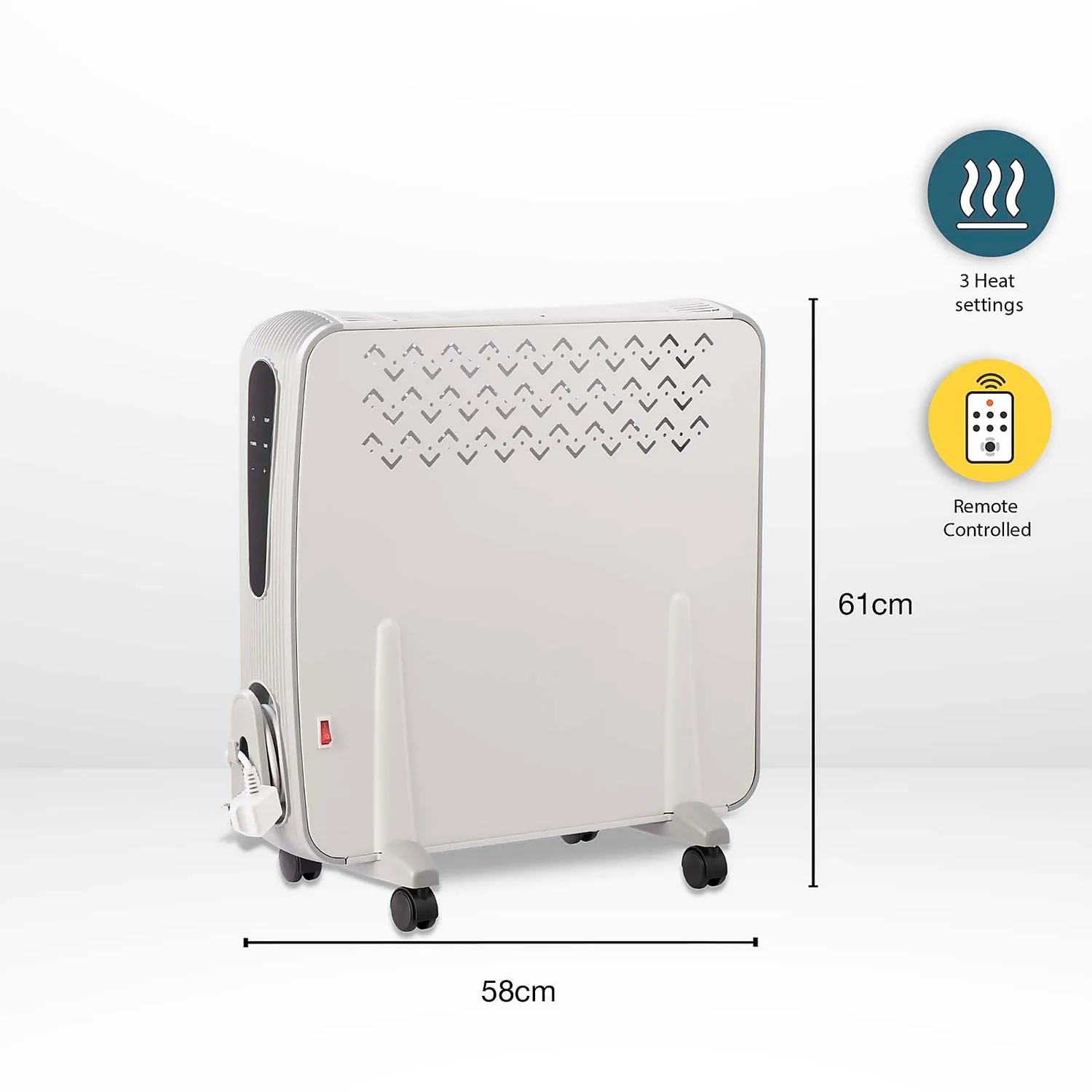 Keep cosy during the colder months with this Stylec 2.4kW Convector Heater. It has an LED display, 3 heating settings: 1000W/1400W/2400W, an electronic adjustable thermostat and timer from 1 to 24 hours. 4 rotating wheels means that it can easily be moved to where you need it.