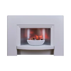 Contemporary styled electric fireplace featuring a curved brushed steel back panel, that reflects the warming glow from the elegant white bowl.