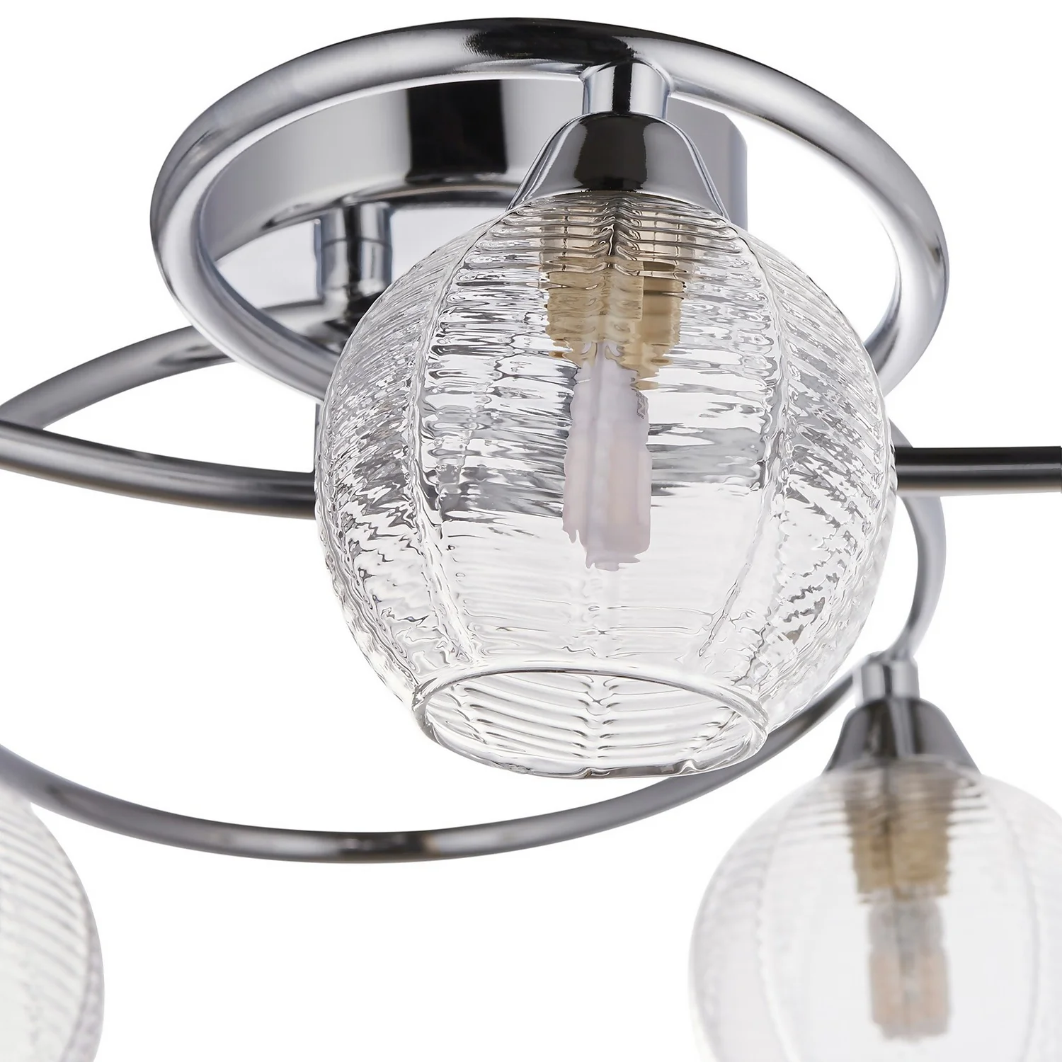 A lovely modern scluptural ceiling light. Chrome plated with complementary clear ribbed glass which creates a beautiful light effect when lit.