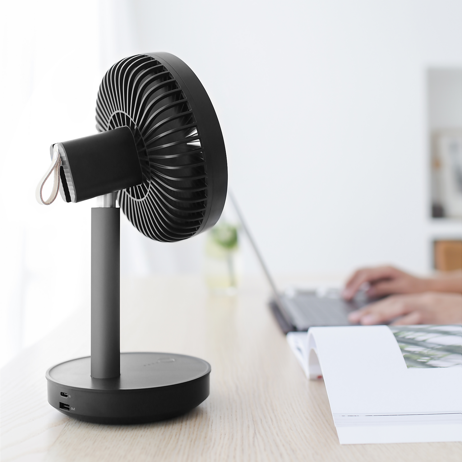 - Sleek and compact desk fan that is designed to deliver a refreshing breeze wherever you go